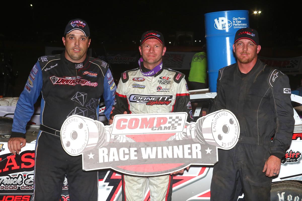 Jesse Stovall worked into the runner-up spot during the feature’s opening laps and crossed the line in the second position. Robert Baker came from the sixth-starting spot to finish third, while Mississippi’s Brian Rickman passed seven cars to finish fourth. Timothy Culp ran in a podium position for the first half of the race before settling into a fifth-place finish.