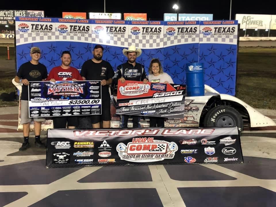 By Ben Shelton (Fort Worth, TX) -- The COMP Cams Super Dirt Series presented by Lucas Oil sanctioned the opening round of the inaugural Southern Dirt Track Championship on Friday night at The Dirt Track at Texas Motor Speedway. Forty-one entries took part in the event, and Cade Dillard staged a late-race charge to the lead and ultimately the $3,500 victory.