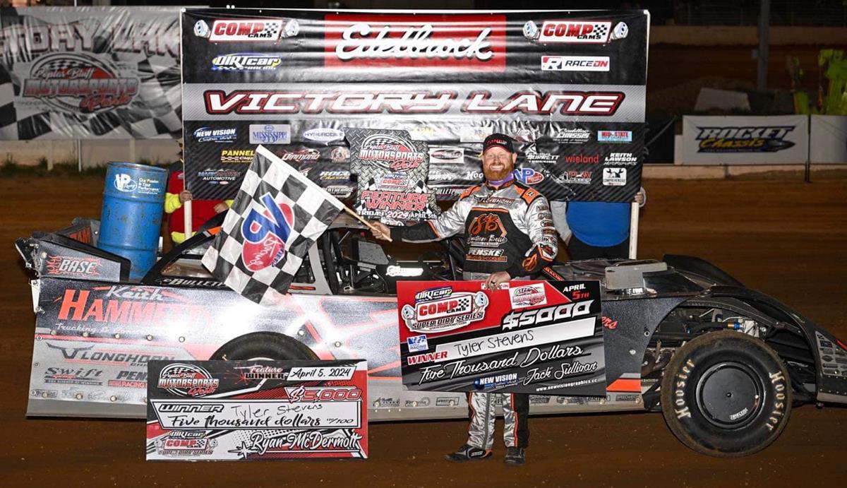 POPLAR BLUFF, Mo. (04/05/24) – After relinquishing the lead during the middle stages of the feature, Tyler Stevens bounced back to the lead on lap 27 and ultimately scored the COMP Cams Super Dirt Series (CCSDS) Super Late Model Series victory on Friday evening at Poplar Bluff (Mo.) Speedway.